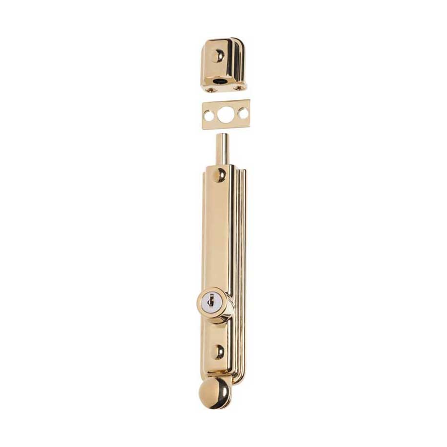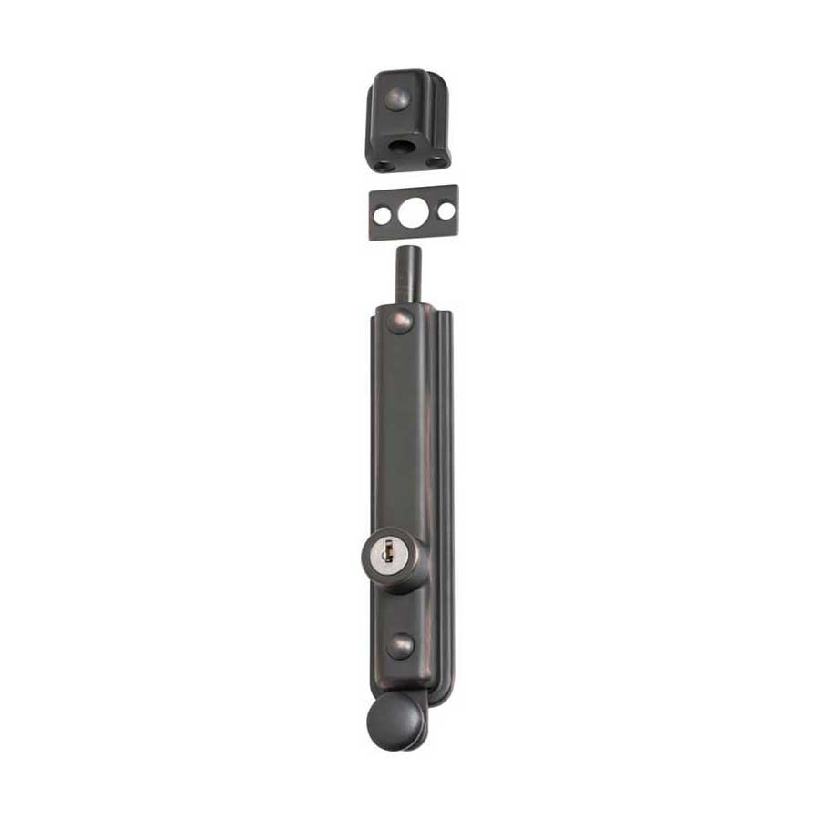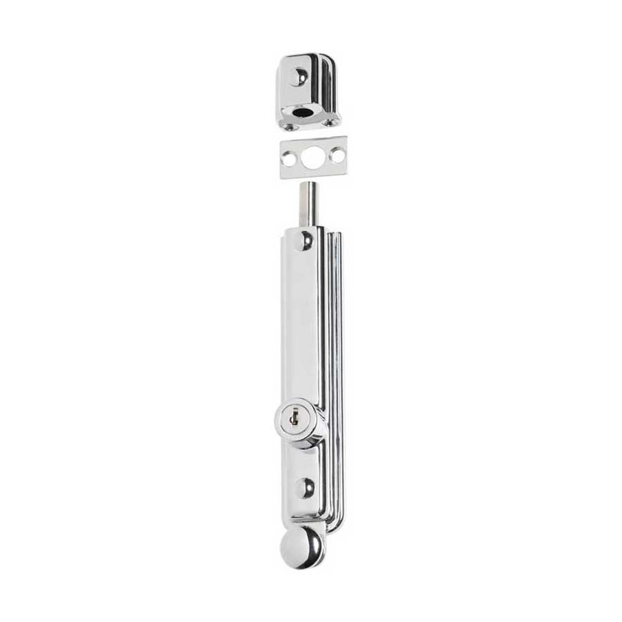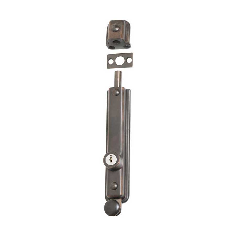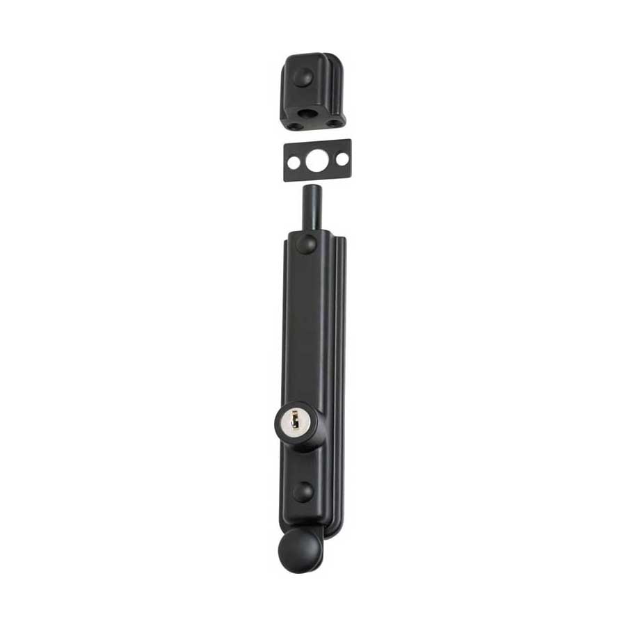 Key operated zinc alloy surface mounted bolt. Can be keyed alike.